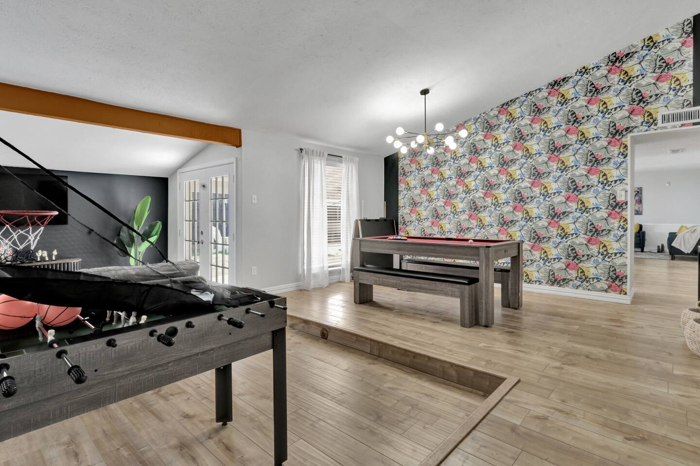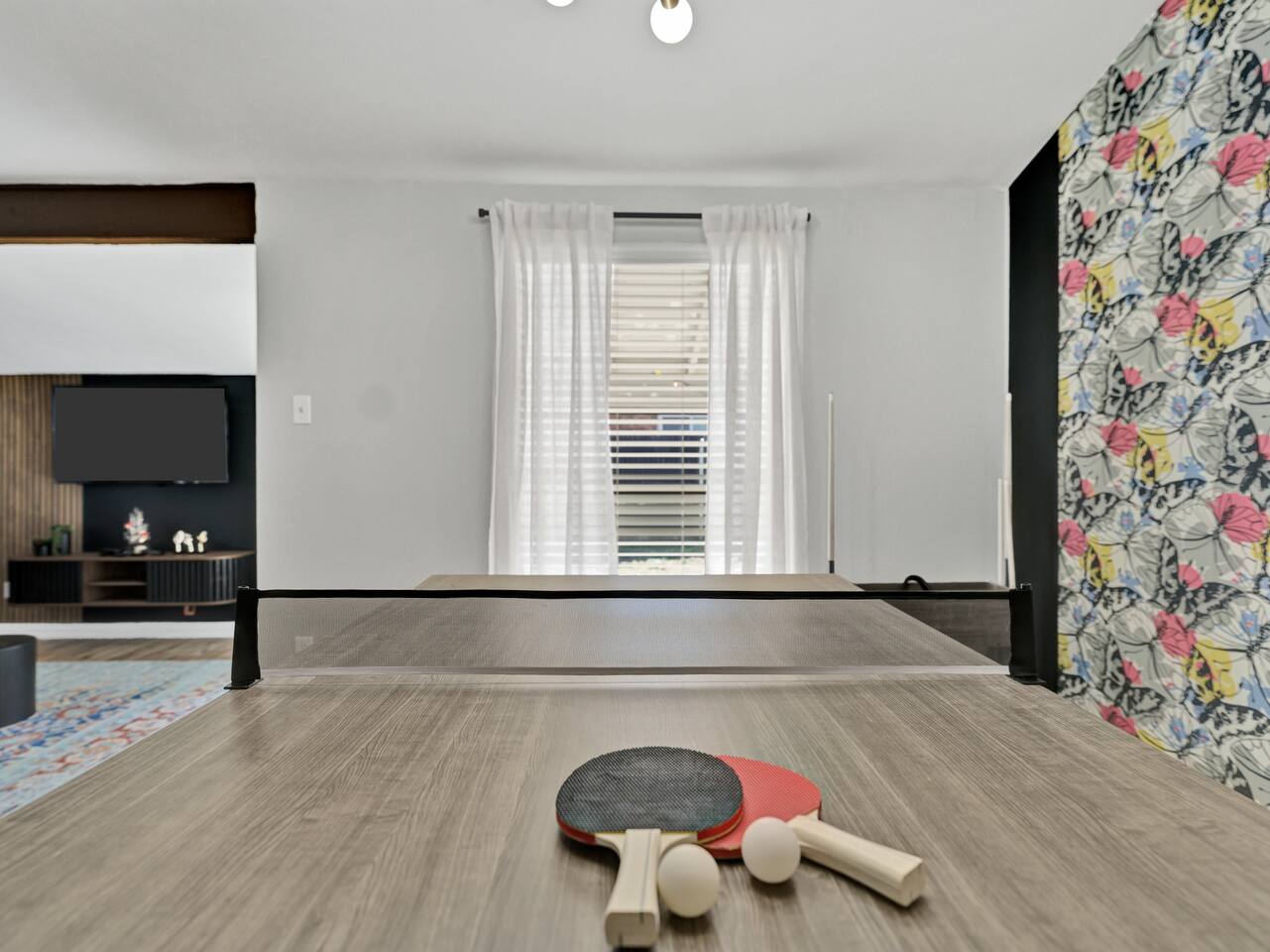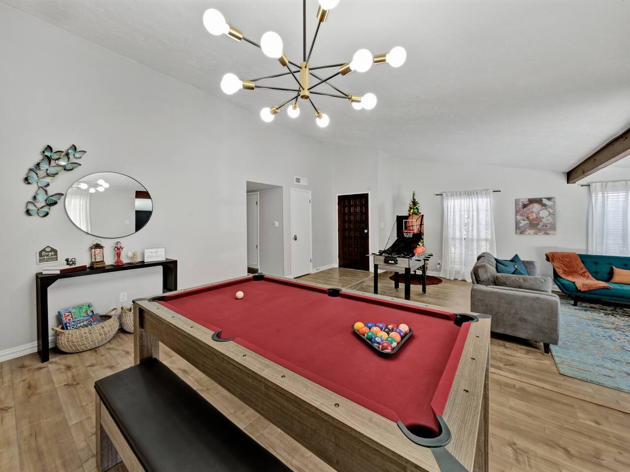 FIFA Mins from AT&T Stadium Welcome to the Butterfly Haven Retreat, This charming oasis features 3 spacious bedrooms, 3 full bathrooms, 2 cozy living rooms with a sofa bed, and 3 smart TVs. Relax in the luxurious jacuzzi or gather around the fire pit under the stars. The game area with a pool table & ping pong table promises endless fun. Perfect for families or groups, this nature-inspired haven offers comfort, style, and tranquility. Your perfect getaway awaits!